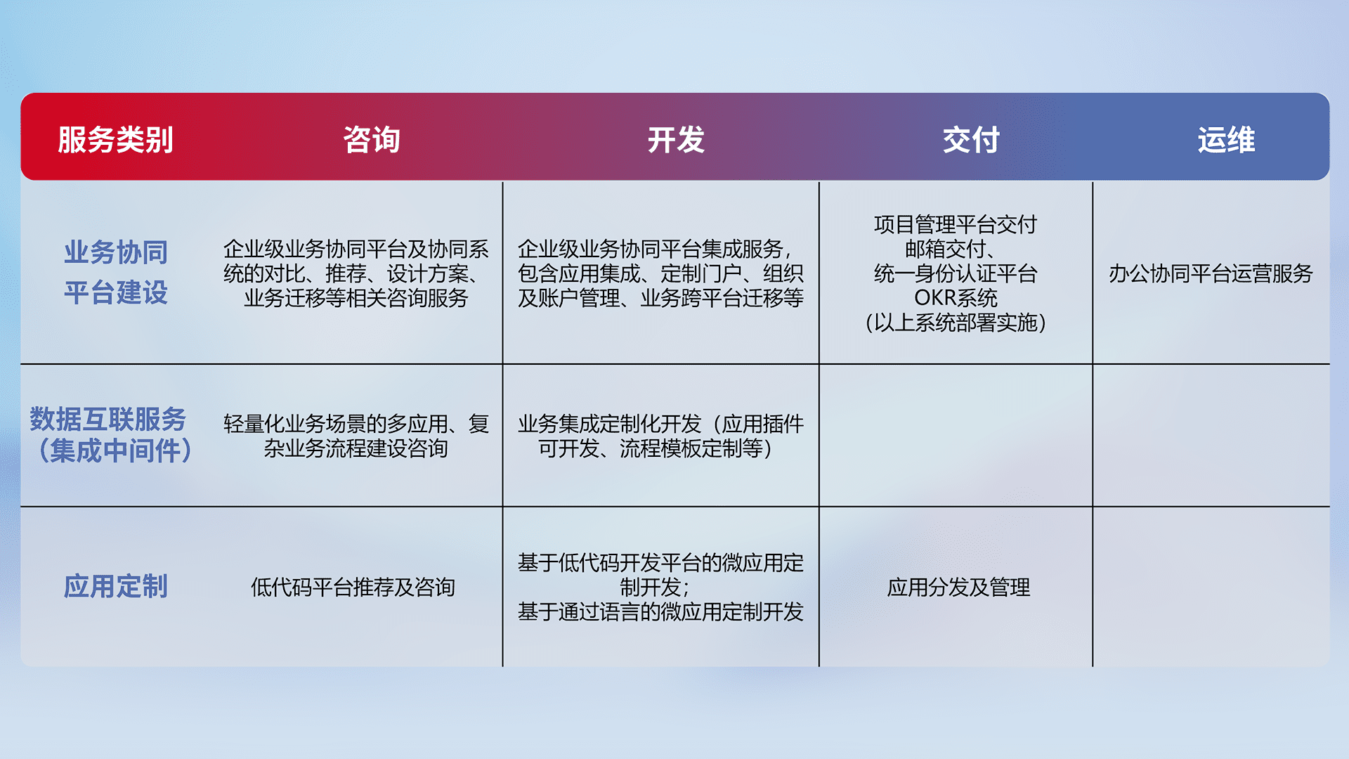 针对钉钉、、、、企微、、IDaas等平台级产品提供产品的规划、、方案、、、、交付、、定制化开发等服务,,,实现如统一协同办公、、、、智能客户服务、、混合会议管理、、、智能数据查询、、等业务场景,,,,实现数字化转型。。。